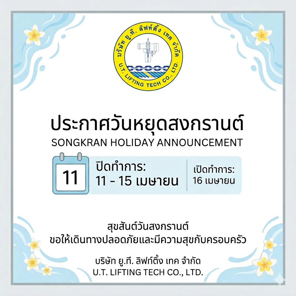 บริษัท ยู.ที. ลิฟท์ติ้ง เทค ก่อตั้ง พ.ศ. 2548 เราเป็นผู้เชี่ยวชาญเกี่ยวกับอุปกรณ์เคลื่อนย้ายวัสดุ เช่น ลวดสลิง, โซ่, พร้อมอุปกรณ์ต่างๆ ที่ใช้ด้วยกัน เรายังมีทีมช่างที่มีประสบการณ์สำหรับงานติดตั้งเครนโรงงาน และ ลิฟท์ขนสินค้า